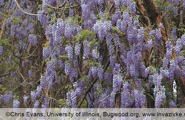 OPIS: Levosučna ovijalka (vzpenja se v smeri nasprotno od urnega kazalca). Listi so spiralno razvrščeni, liho-pernato sestavljeni s 7–13 lističi. Lističi so ozkojajčasti, koničasti. Pozno spomladi se razvijejo številna 20–30 cm dolga, mnogocvetna viseča socvetja. Cvetenje se začne v času olistanja. Vsi cvetovi v enem socvetju se odprejo hkrati. Cvetovi so vijoličasti, pri gojenih oblikah tudi rožnati ali beli. Plodovi so stroki, dolgi 10–15 cm, zreli rjavi, gostodlakavi.