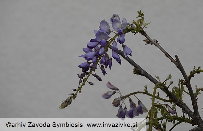 OPIS: Levosučna ovijalka (vzpenja se v smeri nasprotno od urnega kazalca). Listi so spiralno razvrščeni, liho-pernato sestavljeni s 7–13 lističi. Lističi so ozkojajčasti, koničasti. Pozno spomladi se razvijejo številna 20–30 cm dolga, mnogocvetna viseča socvetja. Cvetenje se začne v času olistanja. Vsi cvetovi v enem socvetju se odprejo hkrati. Cvetovi so vijoličasti, pri gojenih oblikah tudi rožnati ali beli. Plodovi so stroki, dolgi 10–15 cm, zreli rjavi, gostodlakavi.